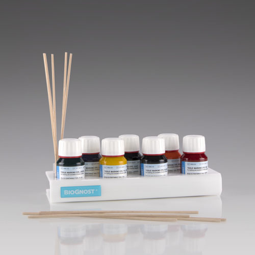 Tissue marking dyes set 7×50 mL contains 7 dyes for tissue marking: green, yellow, black, red, blue, orange and lilac. The set includes wooden sticks and rack.