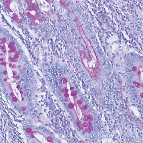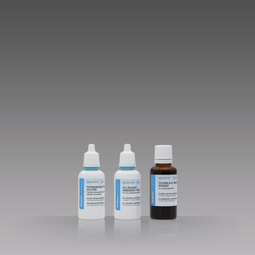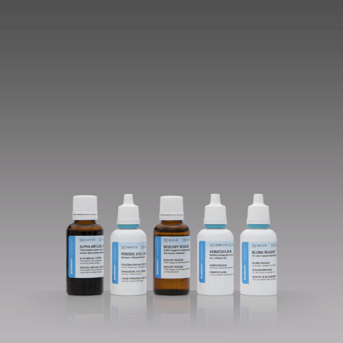Five-reagent Periodic Acid-Schiff kit for staining aldehydes, muccopolysaccharides, mucoproteins and lymphocytes according to Hotchkiss-McManus. P.A.S. staining may also be used for the demonstration of fungal organisms in tissue sections.