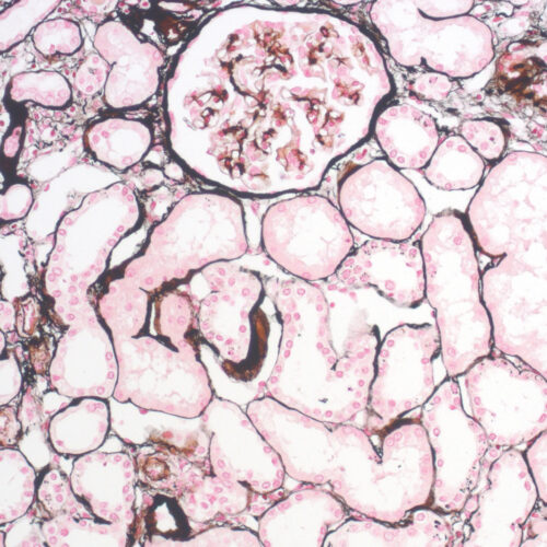 Six-reagent Periodic Acid Silver Methenamine kit for staining kidney glomerular basement membranes. Kit includes red counterstain which provides visually rich contrast to target structures stained black.