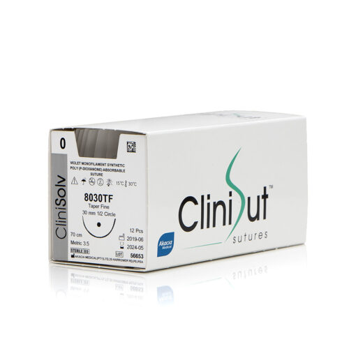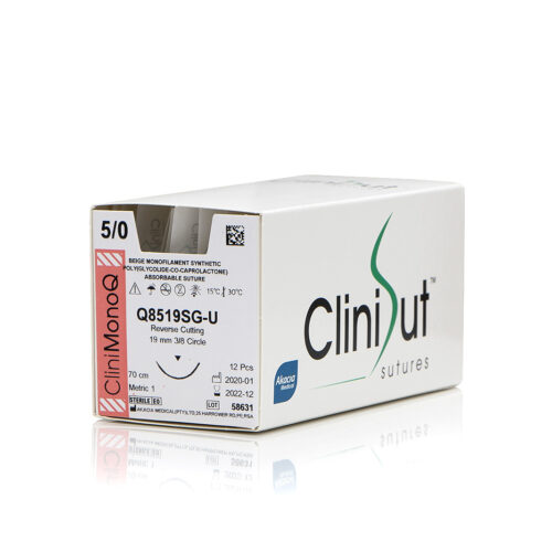 CliniMono is a qundyed monofilament rapid absorbable surgical suture 28 – 29 High initial tensile strength diminishing after 14 days, 60% tensile strength at 7 days, 40% at 14 days and absorption complete in 90 days.Used for skin closure and non-permanent wound support, general, gynae, urology and plastic.