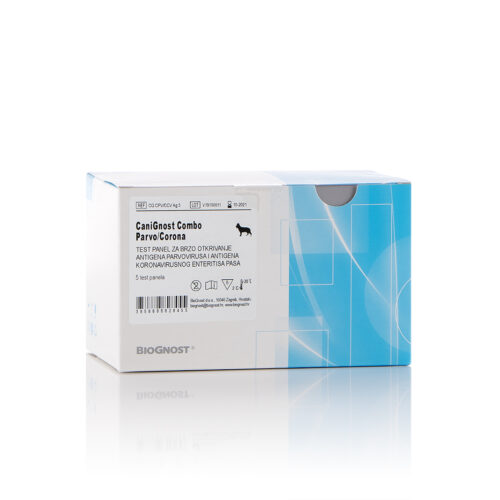 CaniGnost Combo Parvo/Corona is a rapid immunochromatographic test for the qualitative detection of parvovirus antigen and/or canine coronaviral enteritis in feces or in vomited content of the canine stomach. For professional in vitro diagnostic use only.