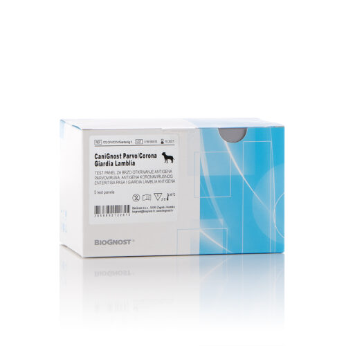 CaniGnost Combo Parvo/Corona/Giardia is a rapid immunochromatographic test for the qualitative detection of parvovirus antigen and/or canine coronaviral enteritis and/or Giardia spp. antigen in feces or in vomited content of the canine stomach. For professional in vitro diagnostic use only.