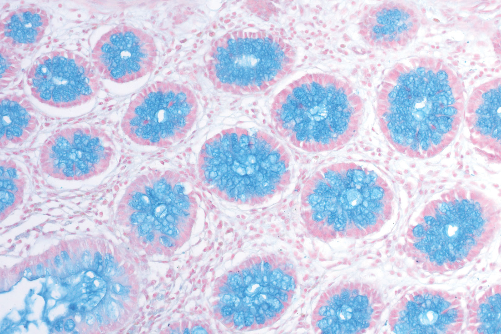 Alcian Blue dye is used to prove glycosaminoglycan in mucins, for staining amyloids, cysteines and for polychromatic staining of mastocytes according to Alcian-Blue Safranin. It is also used to determine bacterial species and detecting bacterial capsules. Alcian Blue pH 2.5 kit enables adequate staining and visualization of acid mucins without staining sulfated mucins. Rinsing solutions are of the same pH value, making the specificity of the reaction more intense. Cellular nuclei are stained red using a counterstain.
