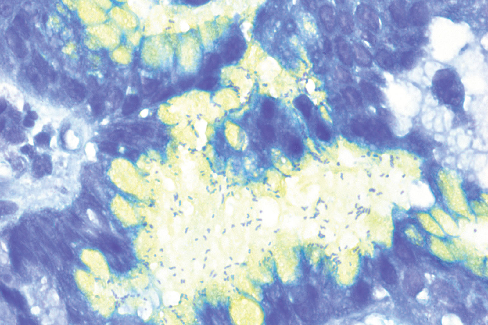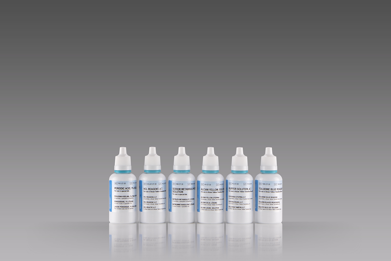 Alcian Yellow Toluidine Blue is used for visualization of H. pylori found in endoscopic and surgical stomach samples. In the first step Alcian Yellow is specifically bound for previously oxidized mucins; gastric bacteria are stained afterward, as well as cellular nuclei and other structures using Toluidine Blue. This provides excellent contrast between dark blue stained bacteria placed on a yellow surface and extracellular foveolar mucins.