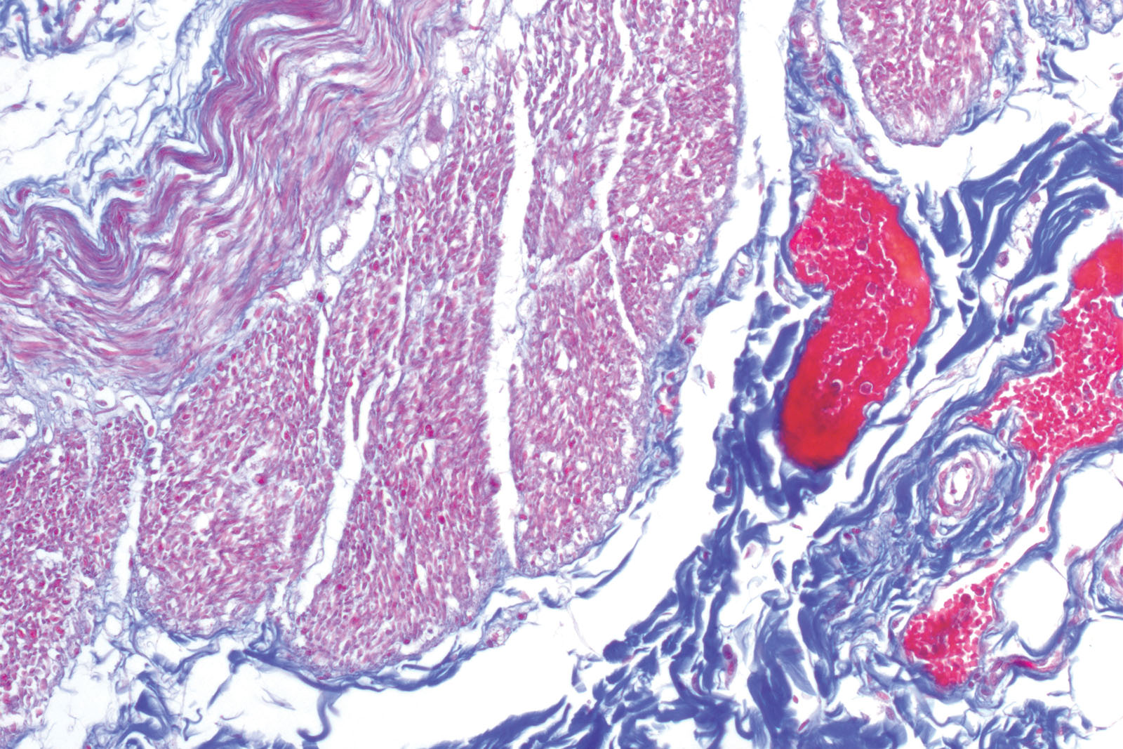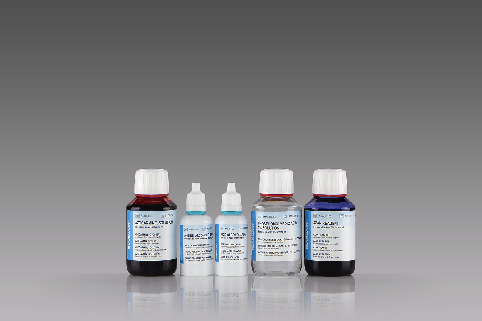 Azan Trichrome kit is a modification of Mallory Trichrome kit for staining connective tissue. It is used for visualizing muscles, collagen fibers, glial cells, glomerular cells, chromatins and erythrocytes of the same section. The kit contains two acid dyes: Azocarmine G and Aniline Blue counterstain. Azocarmine G is used at the beginning stage of the staining procedure, and Aniline Blue is used at the final stage after the section is treated with phosphomolybdic acid. In order to achieve high-quality staining results, it is necessary to stain the section using Azocarmine G and then differentiate it progressively using aniline alcoholic solution in order to enable counterstaining of certain structures (such as collagen) of the section.