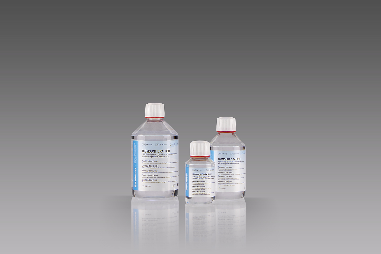 BioMount synthetic covering/mounting media provide expected tissue transparency and sample preservation during the period of several years. BioGnost media’s refractive indices are similar to those of glass slide and cover glass. That does not cause the unwanted refraction of light and it provides a clear and detailed image of the section. BioMount, BioMount High, BioMount DPX, BioMount DPX High, BioMount DPX Low, BioMount DPX New and BioMount C media are xylene-based. That makes them compatible with BioGnost’s BioClear xylene, clearing/deparaffinizing medium. BioMount M is toluene-based media for covering and mounting samples, while BioMount New and BioMount New Low are universal media based on isoparaffin xylene substitute and are compatible with BioGnost’s BioClear New medium for clearing/deparaffinizing, but with BioGnost’s BioClear xylene.