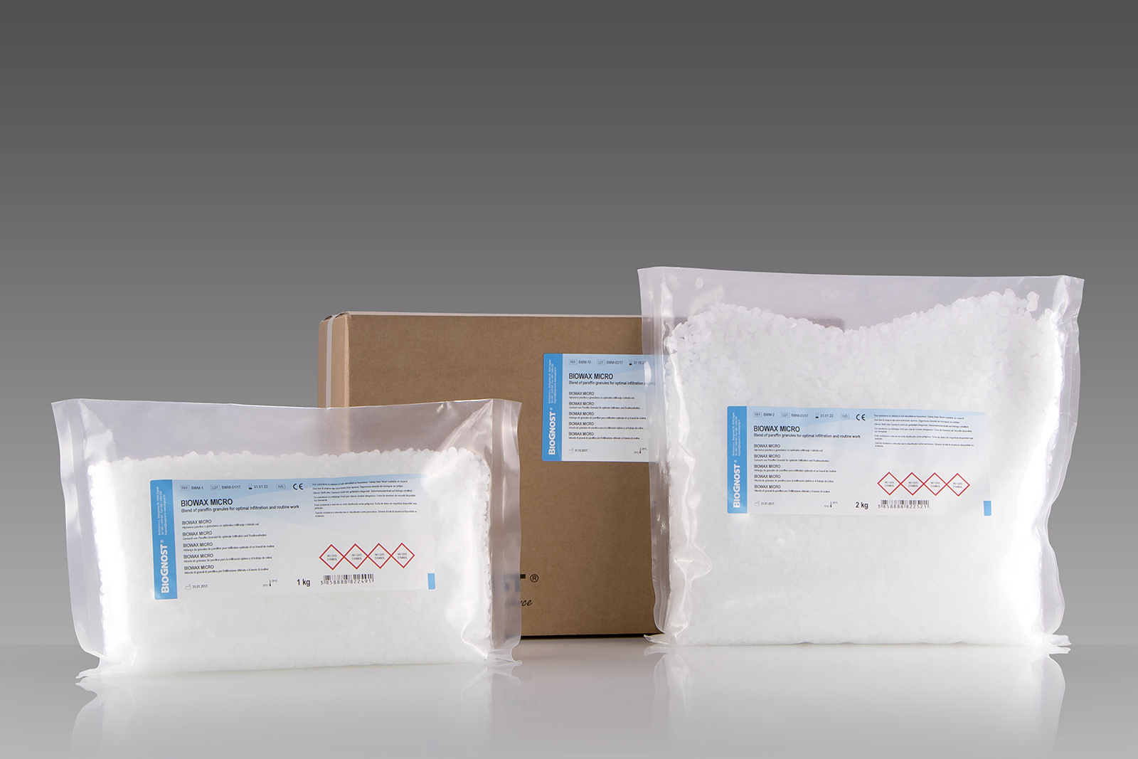 Paraffin is the most commonly used medium for infiltration, embedding and creating tissue blocks. It enables the processing of large amounts of tissue samples in a short period of time, serial samples can be easily obtained. Routine staining, but also the most complicated ones can be done simply. BioGnost’s BioWax Micro paraffin is recommended for use in routine infiltration and embedding procedures, as well as sections. BioWax Micro paraffin is characteristic of a high degree of processing and infiltration, as well as of addition of microcrystals which in turn enables optimal tissue infiltration, low level of resistance during cutting and excellent tissue strips formation. These properties enable excellent infiltration into tissues and reduce the tendency of tissue to crack. Its granulated form allows easier handling and faster melting with a melting point at 54°C/57°C. Sections can then be stained using standard histological techniques or use in different immunohistochemical and molecular-biological reactions.