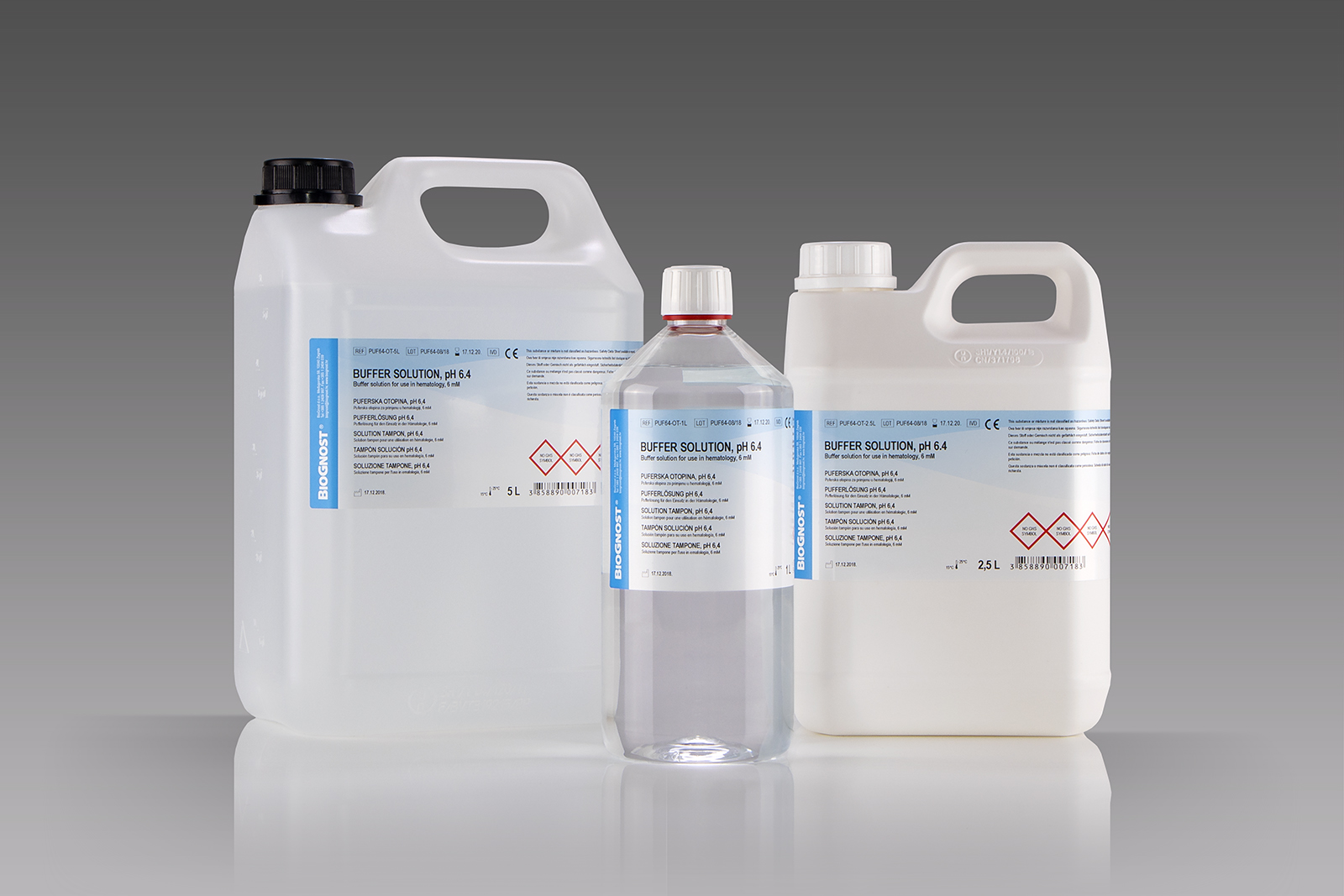 BioGnost’s Buffer solution pH 6.4 contains sodium and potassium phosphates that enable the solution to be buffered at pH 6.4. The buffer solution’s molality is 6 nM and it is recommended for use in practical hematology during blood smears staining procedures. In that case the buffer solution is essential for preparation of diluted Giemsa/May-Gruenwald/Wright/Leishman solutions and for rinsing stained samples without causing destaining of stained cells. Buffer solutions are solutions of weak acids and theirs salts or weak bases and their salts. They enable maintaining approximately constant pH value by adding a certain amount of strong acids or bases.