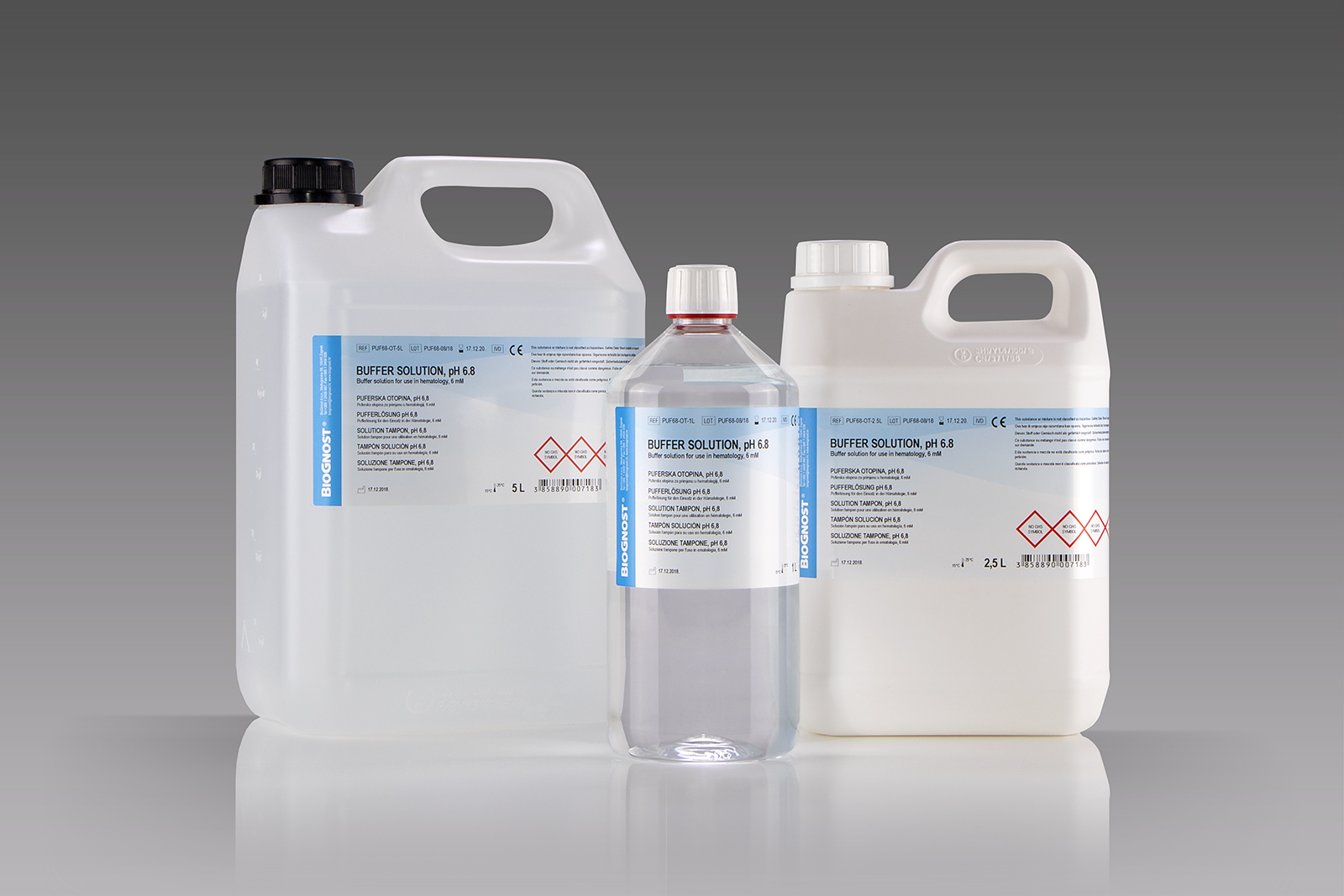 BioGnost’s Buffer solution pH 6.8 contains sodium and potassium phosphates that enable the solution to be buffered at pH 6.8. The buffer solution’s molality is 6 nM and it is recommended for use in practical hematology during blood smears staining procedures. In that case the buffer solution is essential for preparation of diluted Giemsa/May-Gruenwald/Wright/Leishman solutions and for rinsing stained samples without causing destaining of stained cells. Buffer solutions are solutions of weak acids and theirs salts or weak bases and their salts. They enable maintaining approximately constant pH value by adding a certain amount of strong acids or bases.
