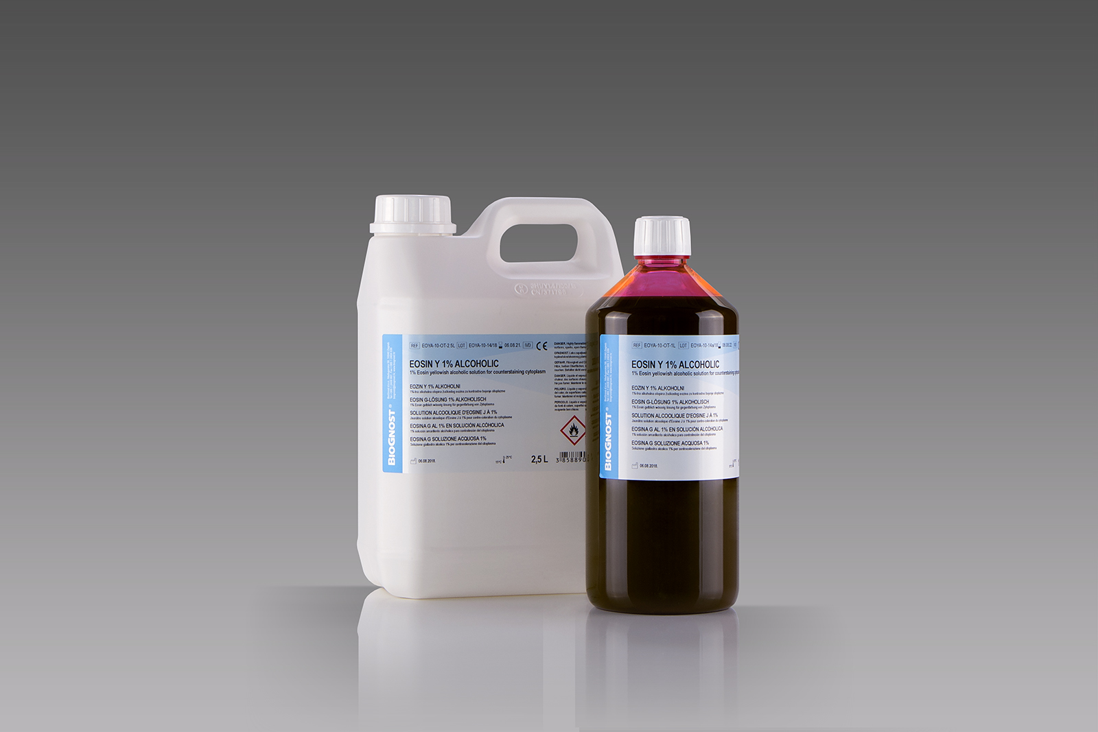 BioGnost’s Eosin Y 1% is an alcohol reagent which is commonly used as a contrast dye for hematoxylin in the histological staining method, the hematoxylin and eosin (HE) staining. This method achieves better cellular structure visualization and differentiation. The microscopic samples’ nuclei are stained blue using hematoxylin, then they are stained various shades of pink using cytoplasm eosin. Eosin Y is a fluorescein derivative. As color powder it can be used as a reagent mixture often used in histological, but also in cytological methods of staining, such as the Papanicolaou method in exfoliative cytology or for creating Romanowsky dyes. Eosin Y is anion dye which stains erythrocytes bright red, and it also stains basic cellular components, such as cytoplasm, collagen, and muscle fibers.