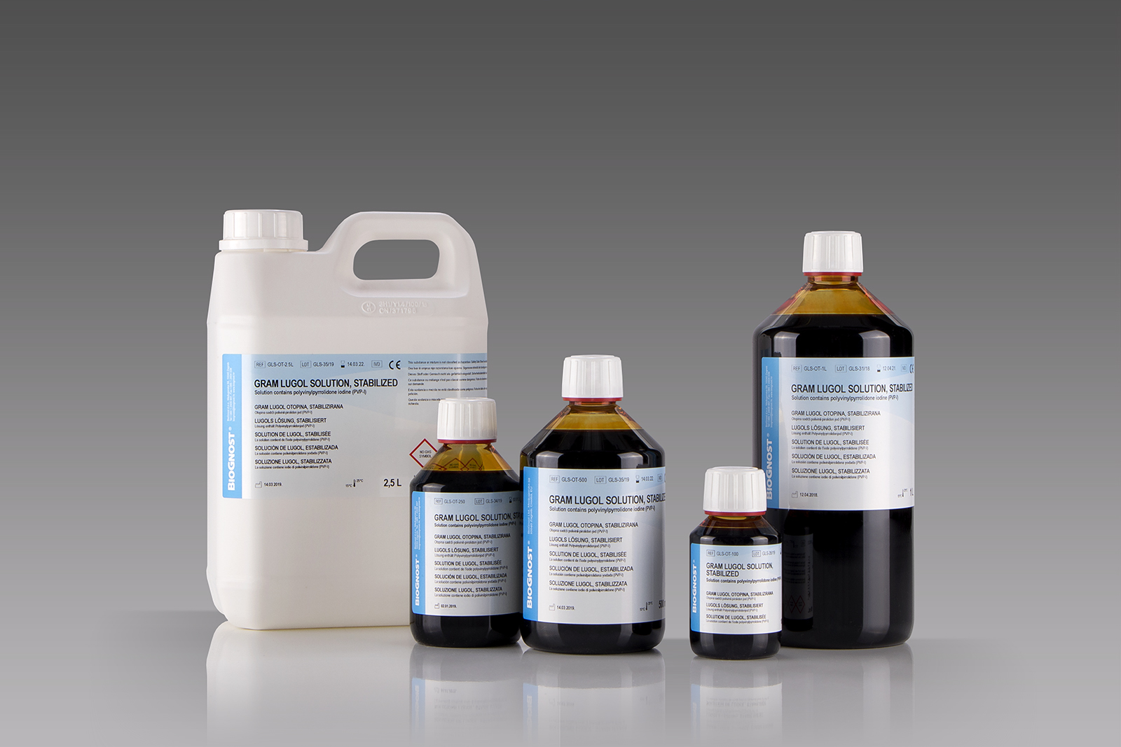 BioGnost’s Stabilized Gram Lugol consists of aqueous solution of stabilized (polyvinylpyrrolidone) iodine (PVP-I) and potassium iodide. During the Gram staining process the solution enables the dye to enter the bacterial cell and create insoluble iodine and primary dye complex. That enables dye retaining and subsequent Gram-positive bacteria identification.