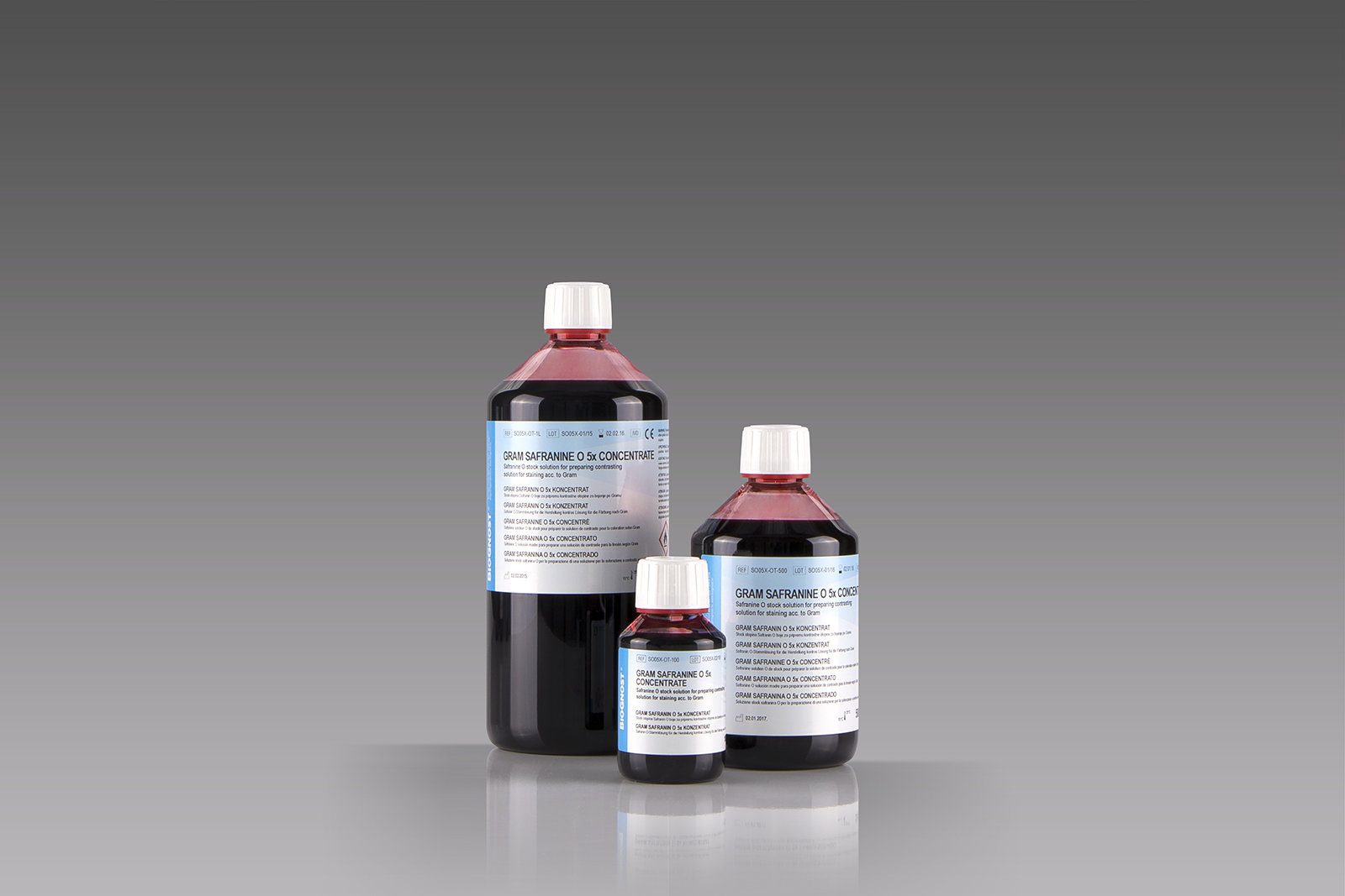 Gram Safranine 5X concentrated stock solution is used for bacterial Gram staining. The solution must be diluted before use and used for counterstaining Gram-negative bacteria. That enables differentiating the blue and purple-colored Gram-positive bacteria from the red-colored Gram-negative bacteria. Apart from use in bacteriology, Safranine O solution can also be used in histology and cytology because it stains cellular nuclei red. It is used for identification of cartilage, mucins, and mastocyte granules. It also enables identification of chondrocytes made from human and rodent mesenchymal stem cells.
