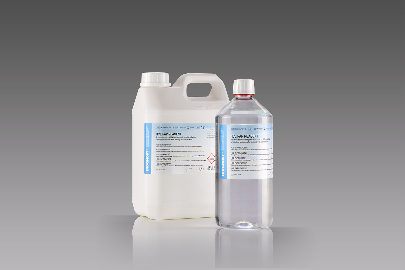 HCL Pap reagent is a differentiation reagent used primarily in regressive staining of cytology samples according to Papanicolau. It contains very low concentration of hydrochloric acid and it enables excellent differentiation of nuclei and non-nuclear structures. After the samples are stained with hematoxylin during regressive staining method, the residual dye is washed of from the nucleus, as well as off the cytoplasm. That leaves cells with clearly defined cellular details and intercellular structures to be further stained using OG-6 (or Orange II) and EA reagents.