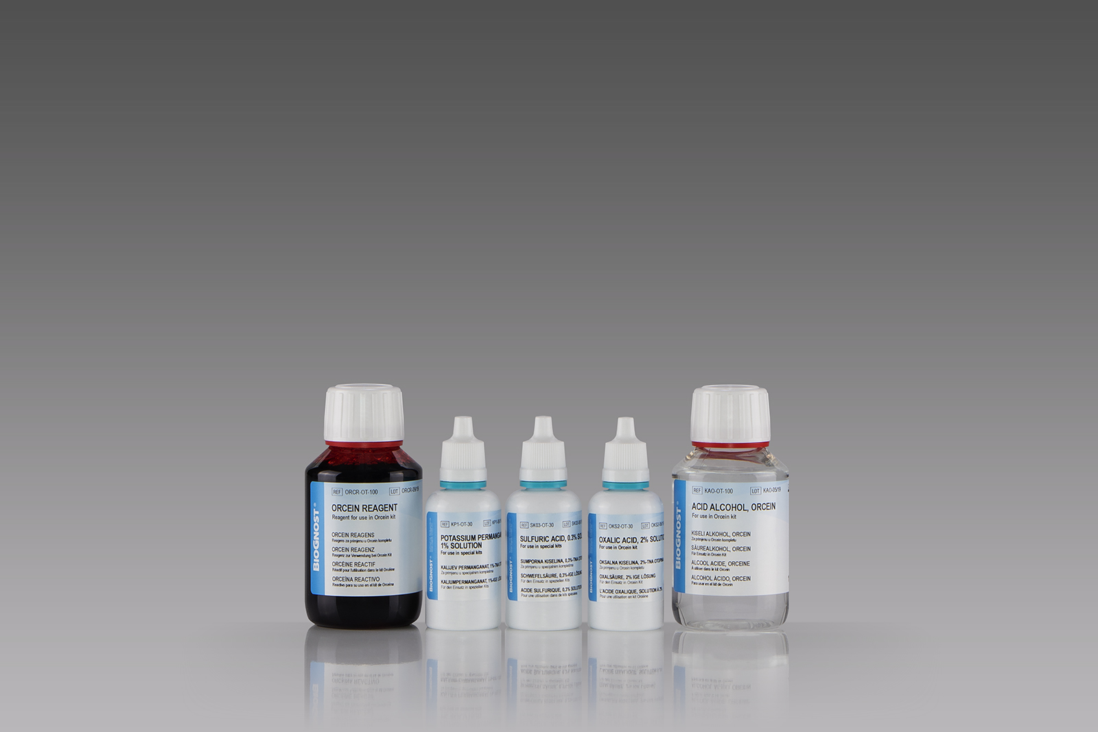 Orcein kit is used for identification of inclusion bodies of surface hepatitis B (HBsAg) antigens, elastic fibers and protein complexes with copper. It may be used with the sections embedded in paraffin, but also with frozen sections. It is also recommended to fix the sections prior to procedure by using neutral buffered fomaldehyde.