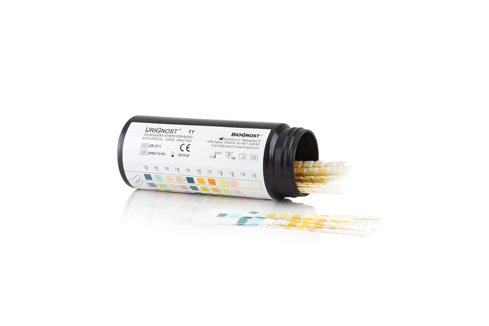 For visual and instrumental urinalysis. The test detects ascorbic acid (ASC), glucose (GLU), bilirubin (BIL), ketones (KET), specific gravity (SG), blood/hemoglobin (BLO), acidity/alkalinity (pH), proteins (PRO), urobilinogens (URO), nitrites (NIT) and leukocytes (LEU). Range of time needed for the result to display is 30-120 seconds.