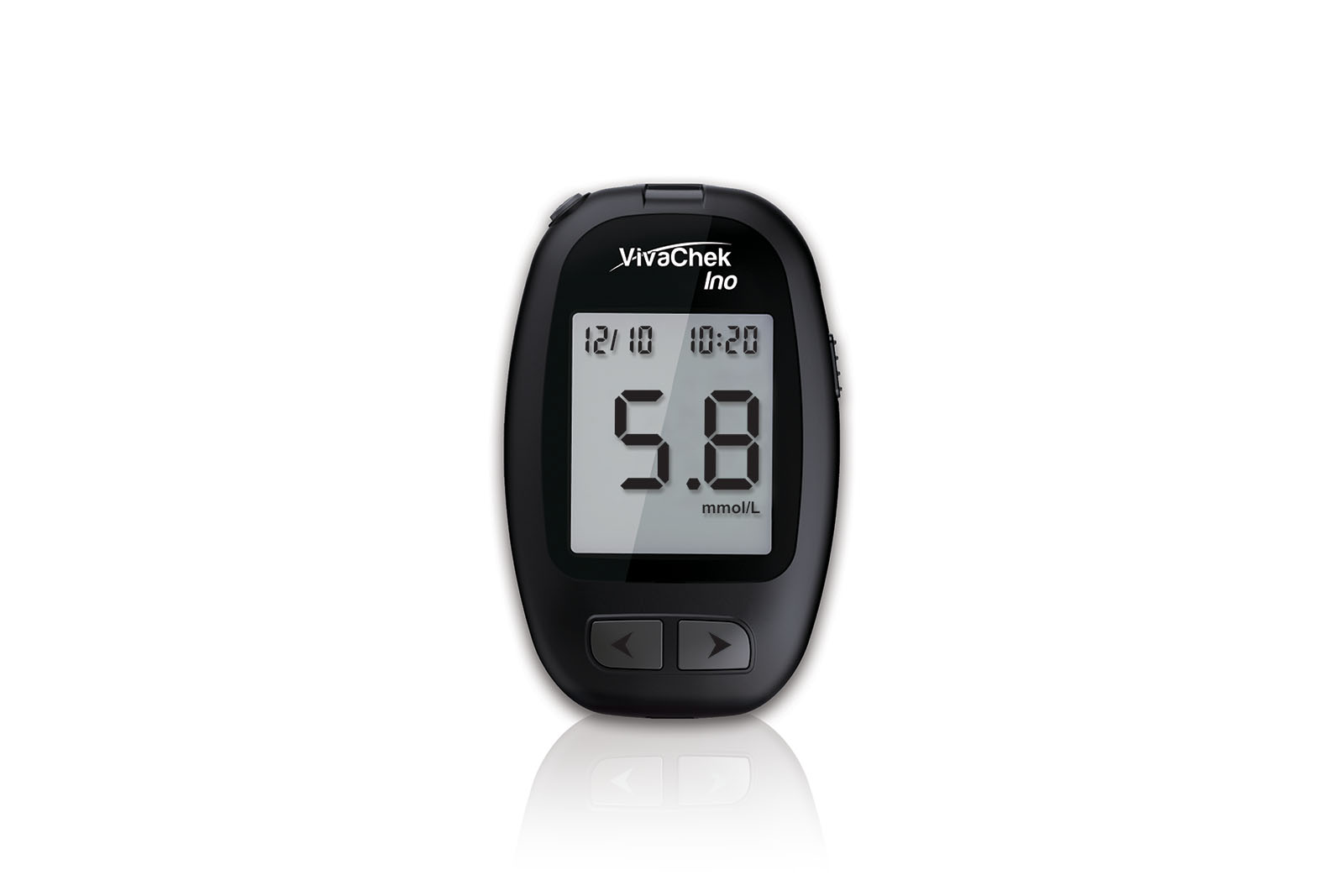 The VivaChek ™ Ino system is designed to quantitatively determine blood glucose levels in a fresh capillary whole blood sample. The test is based on measuring the electric current caused by the reaction of glucose and reagents at the electrode located on the test strip. The blood sample is pulled to the top of the test strip by capillary action. Glucose in the sample reacts with glucose enzyme and mediator. Electrons are created, creating a current that is positively correlated to the glucose level in the sample. After the reaction time, the glucose levels in the sample are displayed. The glucometer was calibrated to display plasma glucose levels. The system is intended for external use (in vitro diagnostic use) for diabetics at home and healthcare professionals in clinics; the system is used as a means of controlling diabetes. The system is not intended to diagnose diabetes.